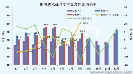 國內產量方面,據統計,2009 年8 月國內聚乙烯產量為68.4 萬噸,較去年同期(61.9 萬噸)增加6.5 萬噸,增幅為10.5%;1-8 月累計產量為497.7 萬噸,較2008 年同期(508.5 萬噸)減少10.8 萬噸,減幅為2.1%。