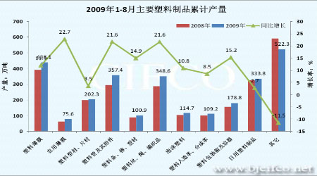 圖十一 2009年1-8月各類塑料制品累計產量及增長率