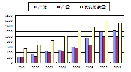 近年來(lái),我國(guó)對(duì)PTA的需求量增長(zhǎng)非常快,國(guó)內(nèi)產(chǎn)能難以供給國(guó)內(nèi)需求。在這種背景下,2007年以后,上馬了大量PTA產(chǎn)能,預(yù)計(jì)今年將投產(chǎn)的新建設(shè)備有:浙江逸盛石化150萬(wàn)噸、佳龍石化江陰60萬(wàn)噸、蓬威石化90萬(wàn)噸、翔鷺石化廈門(mén)150萬(wàn)噸,儀征化纖100萬(wàn)噸擴(kuò)產(chǎn)項(xiàng)目可能在今年年底到明年年初投產(chǎn),時(shí)間尚未確定。截止10月初,逸盛石化與翔鷺石化新建產(chǎn)能已經(jīng)投產(chǎn),而佳龍石化計(jì)劃將投產(chǎn)時(shí)間推遲到明年一季度,蓬威石化9月底已竣工,預(yù)計(jì)年內(nèi)試運(yùn)行。這樣看來(lái),到今年年底,我國(guó)PTA產(chǎn)能保守估計(jì)將擴(kuò)充300萬(wàn)噸,達(dá)到1530萬(wàn)噸,而從我國(guó)近兩年的消費(fèi)量以及下游需求規(guī)模來(lái)估算,今年表觀(guān)消費(fèi)量在1500萬(wàn)噸上下。這就意味著,到今年年底,國(guó)內(nèi)的產(chǎn)能將超過(guò)消費(fèi)量。