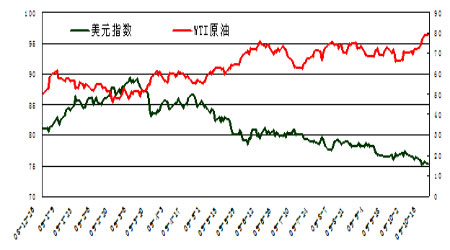 9月底,原油發(fā)動了一輪新的攻勢。尤其令人驚異的是,從10月8日開始,NYMEX11月份WTI期貨合約連收8日陽線,一路突破6月以來一直阻礙原油上攻的75美元阻力線,將戰(zhàn)線推進到80美元附近。截至10月19日收盤,WTI原油收于79.61美元/桶,創(chuàng)出自去年11月份以來的新高。
