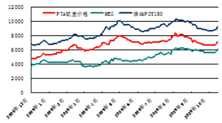 圖為PTA、乙二醇(MEG)與滌綸絲價格相關圖。(圖片來源:廣發期貨)