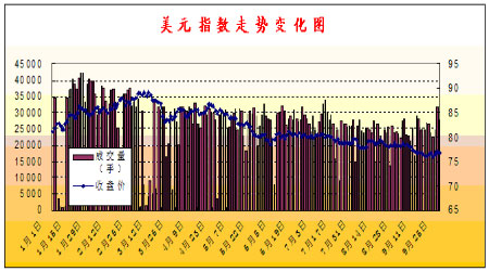 自去年金融危機爆發以來,為了刺激經濟復蘇,美國自去年底將美國將聯邦基金利率即商業銀行間隔夜拆借利率維持在歷史最低點零至0.25%。2月17日,剛上臺不久的美國總統奧巴馬簽署了總額高達7870億美元的經濟刺激計劃,在這之前,上屆總統布什已經簽署過類似的計劃。美國的這一政策使得大量的流動性注入到貨幣市場領域,為防止流動性陷阱的出現,伯南克3月份推行了量化寬松政策。這一政策,到目前看來取得了一定的效果,股市回升,金融機構財務好轉,房市也有復蘇跡象。但是過度的流動性還是產生了一系列的問題,首先是美元貶值的問題。如圖14所示,美元指數從3月中旬以后開始逐步走低,只是到了9月23日,美聯儲召開聽證會后決定,繼續維持0-0.25%的基準利率區間不變,同時計劃使用逆回購協議,收回注入經濟1萬億美元現金的部分資金,美元指數才止住跌勢。