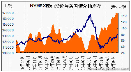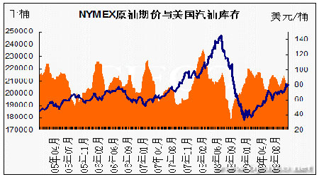 圖為NYMEX原油期價與美國汽油庫存走勢圖。(圖片來源:北京中期)