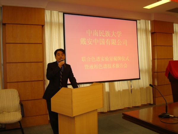 為加強(qiáng)液相色譜分析方法的開發(fā)、為技術(shù)人員提供更好的液相色譜應(yīng)用平臺(tái),中南民族大學(xué)與戴安中國有限公司共同建立了液相色譜聯(lián)合實(shí)驗(yàn)室,并于2009年11月3日在中南民族大學(xué)學(xué)術(shù)交流中心第一會(huì)議室進(jìn)行聯(lián)合色譜實(shí)驗(yàn)室揭牌儀式。中南民族大學(xué)雷振揚(yáng)副校長,設(shè)備管理處孫奉?yuàn)涮庨L,戴安中國有限公司總經(jīng)理杜平先生出席了揭牌儀式,出席儀式的還有中南民族大學(xué)藥學(xué)院盤劍波書記、楊天明副院長、梅之南副院長以及中南民族大學(xué)化學(xué)與材料學(xué)院的鄧克儉院長,中科院生態(tài)環(huán)境中心研究員、戴安中國有限公司應(yīng)用中心負(fù)責(zé)人牟世芬教授,戴安中國有限公司中國區(qū)市場部經(jīng)理劉靜女士以及戴安液相色譜上海應(yīng)用實(shí)驗(yàn)室經(jīng)理李浪先生,中國科學(xué)院化學(xué)研究所研究員劉國詮教授作為特邀嘉賓出席了儀式。參加此次活動(dòng)的還有近百位來自武漢不同院校的老師以及武漢質(zhì)檢、藥檢、藥廠、監(jiān)測站等系統(tǒng)的科技工作者。