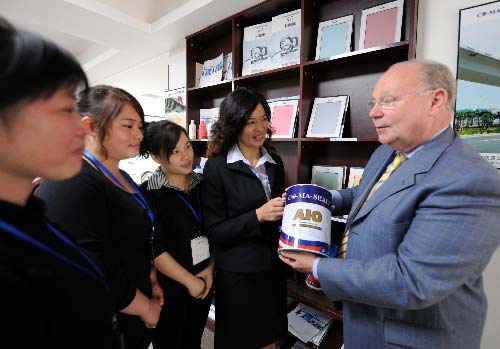 2009年11月11日美國防水巨頭中國傳授技藝11月11日,美國國際涂層科技有限公司副總裁凱文斯·圖爾特(右一)向廈門市千瑞工貿有限公司員工介紹防水涂料使用方法。當日,前來廈門作環保技術指導、考察防水防腐等項目的美國國際涂層科技有限公司副總裁凱文斯·圖爾特來到廈門市千瑞工貿有限公司,對中國員工進行環境保護、防水防腐劑工藝技術指導和培訓。美國國際涂層科技有限公司是一家研發、生產和銷售環保無機滲透結晶型防水防腐劑、涂料等產品的跨國知名企業。