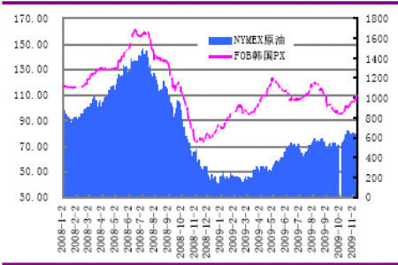 圖為NYMEX 原油與FOB 韓國PX 價格走勢圖。(圖片來源:光大期貨)