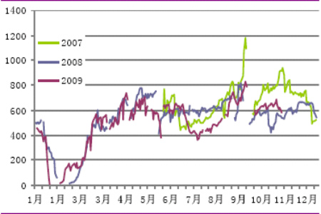 原油出現震蕩行情,PX 價格穩步上漲,逐漸進入正常利潤區間,但較高的生產利潤使得上游成本傳遞滯緩,亦打壓著PTA 現貨價格,現貨市場受期市影響,大幅上漲后走穩;下游聚酯產銷情況良好,但由于前期追漲備貨,目前已呈現觀望態勢;終端紡織業表現平穩,但隨著天氣轉冷,消費是否會有明顯提高值得注意。近期,PTA 上下游的高負荷和產銷支持著上漲行情,資金的介入亦有推波助漲的作用。但PTA 價格連續幾周上漲,市場價格偏離均線支撐幅度過大,短期內存在回調尋求支撐的意愿,后期價格在上行的過程中壓力將逐步顯現。短期內需要關注價格沖高后的回落態勢。建議前期多單可逢高退出,待價格回調后,重新介入。