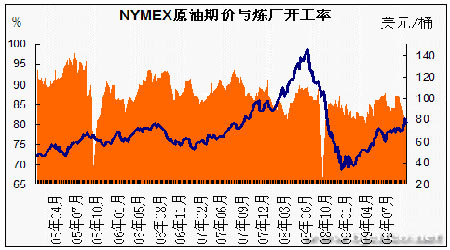圖為NYMEX原油期價與煉廠開工率走勢圖。(圖片來源:北京中期)