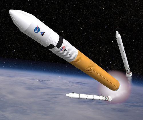 “戰(zhàn)神”5是一種垂直吊裝的兩級重型火箭,能把近188噸的貨物送入低地軌道。在與“戰(zhàn)神”1載人火箭配合共同把有效載荷先送入地球軌道的情況下,“戰(zhàn)神”5可把近71噸的貨物送往月球。向地球軌道發(fā)射時(shí),“戰(zhàn)神”5的第一級依靠的是兩臺5.5段式可重復(fù)使用固體火箭助推器。這兩臺助推器由航天飛機(jī)的固體火箭助推器衍生而來,與作為“戰(zhàn)神”1載人火箭第一級的單臺助推器類似。由于可用同樣的設(shè)施來制造,硬件設(shè)備的這種通用性將提高運(yùn)行使用的效費(fèi)比。