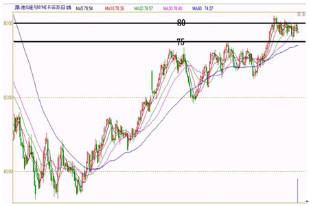 NYMEX原油在10月份沖上80美元/桶之后,截止目前一直維持在80美元/桶以下盤整,11月16日~11月20日當周略有上漲,但總體仍顯現(xiàn)振蕩態(tài)勢。