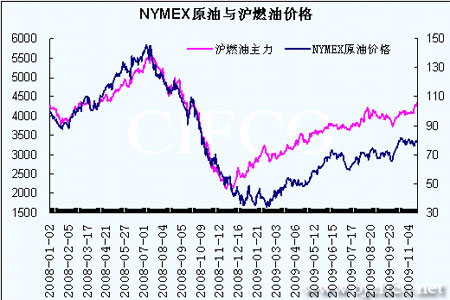 圖為NYMEX燃油與滬燃油價格走勢圖。(圖片來源:北京中期)