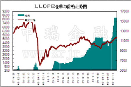 圖為L(zhǎng)LDPE倉(cāng)單與價(jià)格走勢(shì)圖。(圖片來(lái)源:中瑞金融)