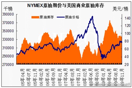 圖為NYMEX原油期價與美國商業原油庫存走勢圖。(圖片來源:北京中期)