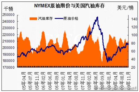 圖為NYMEX原油期價與美國汽油庫存走勢圖。(圖片來源:北京中期)