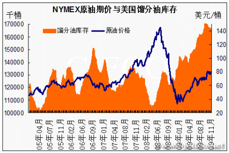 圖為NYMEX原油期價與美國取暖油庫存走勢圖。(圖片來源:北京中期)