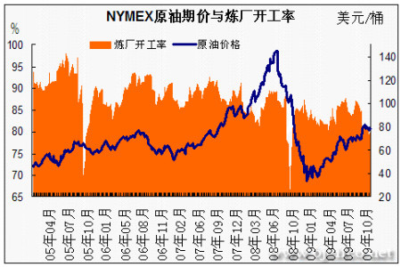 圖為NYMEX原油期價與煉廠開工率走勢圖。(圖片來源:北京中期)
