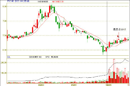 PVC期貨10 月出現超跌反彈,反彈高度達到6945 元/噸后遇阻回落震蕩整理。