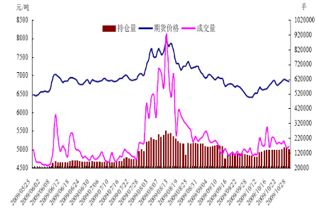 長假過后首個交易日主力合約0911 當天高開后沖高回落,成交不活躍,觀望氣氛濃厚。10 月12 日再度開盤后,主力合約完成換月至1001,當天成交量和持倉量大幅增加,期價出現強勁反彈。在本月 國際原油價格持續上揚的帶動下,PVC 期價出現連續反彈,并如期反彈至6900 元/噸的價位。由于現貨 市場的持續低迷和產能過剩,制約了PVC 期價的進一步上揚。在月末的幾個交易日中,PVC 數次沖擊 6900元/噸上方壓力位,均未能有效突破,以震蕩整理走勢為主。