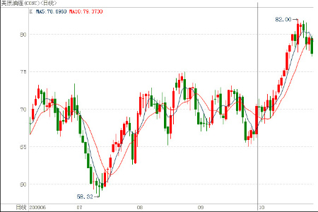 國際原油價格10 月份整體呈現單邊上漲走勢,在美元持續貶值、原油庫存大幅下降預期等利好 因素刺激下,原油價格從70 美元/桶起步,連續突破75、80 美元/桶的整數關口,并創下82 美元/桶的 年內新高。由于連續大幅上漲有調整需求,同時在原油庫存預期落空的帶動下,原油最近5 個交易日出 現沖高回落。
