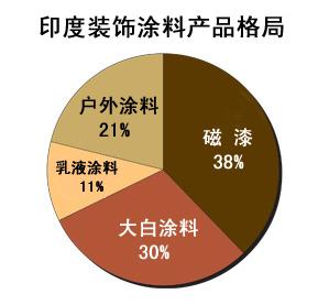 根據2009年印度國內涂料工業運營情況統計顯示,裝飾涂料產品占據了印度涂料工業份額中的絕大部分比例,達到75%;而工業涂料已經在印度展示出了可觀的市場前景,印度國內涂料各個涂料公司也在近年來加大了在汽車涂料以及建筑工程涂料領域的投入力度。