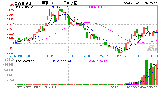 經歷過始于8月中旬的深幅調整,PTA于國慶節(jié)前跌至6590的低點后,逐步展現(xiàn)出企穩(wěn)跡象。節(jié)后第一個交易日,伴隨著持倉量的巨幅放大,PTA主力合約TA0912一舉發(fā)力拉出一根頗具氣勢的巨陽線,成為趨勢轉折的一個關鍵契機。在油價連創(chuàng)年內新高、PX價格震蕩上揚、PTA現(xiàn)貨氣氛不斷升溫、終端聚酯產品整體銷售持續(xù)走高量價同步跟進等眾多利好因素刺激下,PTA期貨表現(xiàn)強勁,一路扶搖直上,已然收復前期大部分跌幅。臨近10月底,主力合約移倉換月至TA1001,多頭勢力強勁,表現(xiàn)勢如破竹,期價一舉沖破60日均線的強壓力位。隨之期價開始反復測試60日均線處的支撐力度,在周邊市場的拖累下于高位維持振蕩。截至10月30日,主力合約TA1001報收于7408元,期價累計漲幅逾10%。
