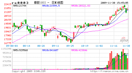 本周全球經濟方面出現利空消息打壓整體金融市場下行,美國政府向下修正三季度GDP經濟數據,似乎經濟復蘇并不像人們預想的順利,周四又傳出迪拜主權債務危機令市場人士擔心金融危機再度卷土重來,金融市場受壓集體下行,而美元則趁機自低位反彈收復周初部分跌幅;中國政府經濟工作會議召開在即,央行加大對市場流動性監管大多數銀行開始提供房地產首付比例,市場對政府收緊資金預期再度襲來,滬深股市對此表現尤為明顯,率先展開調整直接影響期貨市場人氣。期膠市場在此股市及資金等因素影響也在高開展開調整。