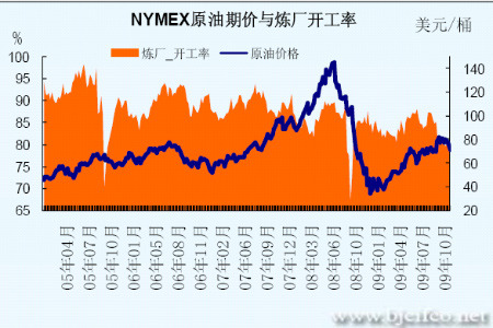圖為NYMEX原油期價與煉廠開工率走勢圖。(圖片來源:北京中期)