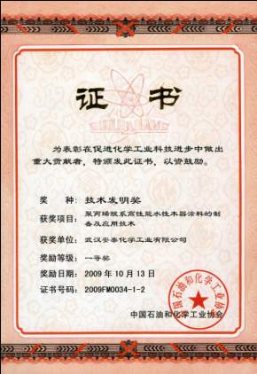 10月20-21日,“中國石油和化工行業結構調整促進大會暨科學技術獎表彰大會”在北京隆重召開。會上,中國石油和化學工業協會表彰了2009年度中國石化協會科學技術獎獲獎項目單位及個人。會議授予中國石油和化學工業技術發明獎22項(其中一等獎8項、二等獎9項、三等獎5項),科技進步獎300項(其中一等獎51項、二等獎108項、三等獎141項),武漢安泰化學工業有限公司的《高性能聚丙烯酸系水性木器涂料的制備和應用》榮獲科學技術發明獎一等獎。