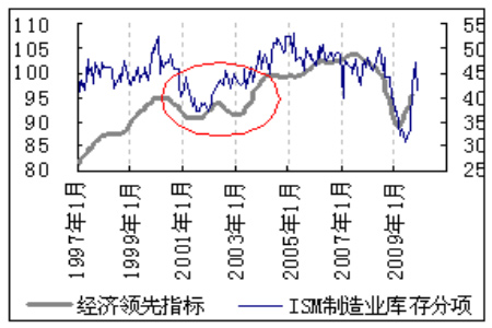 圖為美國(guó)經(jīng)濟(jì)領(lǐng)先指標(biāo)和ISM制造業(yè)庫(kù)存分項(xiàng)對(duì)比圖。(圖片來(lái)源:路透)