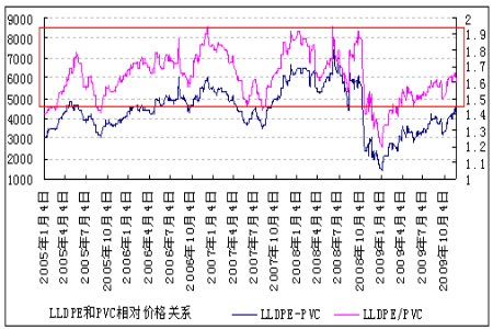 圖為L(zhǎng)LDPE和PVC的比價(jià)有明顯的區(qū)間性特點(diǎn)圖。(圖片來(lái)源:金銀島)