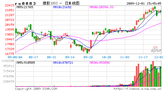 本周國內(nèi)股票和期貨市場大幅波動,滬膠的走勢也同樣未能避免。盡管周二A股市場的大跌拖累了滬膠價格的沖高,但周三的時候滬膠仍然頑強走高。本周最高價出現(xiàn)在周四,1003合約達到了22415元的高點,不過這一高位并未保持多長時間,此后在股票市場和其余期貨品種走低的影響下,膠價盤中一路下跌。周五,受到迪拜主權(quán)債務危機消息的影響,亞洲市場交易時段內(nèi)各品種均出現(xiàn)暴跌行情,滬膠午后跳水,大幅度殺跌,1003合約輕松跌穿21400的支持位,最低達到了21100元。本周滬膠行情一方面受到周邊市場影響較大,另外一方面也是短期內(nèi)大量獲利盤平倉所致,從下表可以看出本周滬膠總持倉減少33000噸左右,主力資金在系統(tǒng)性風險增大的情況下選擇了獲利觀望。