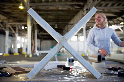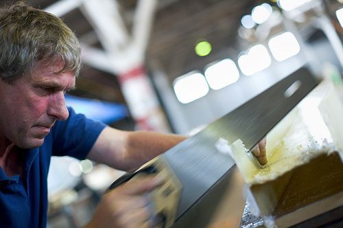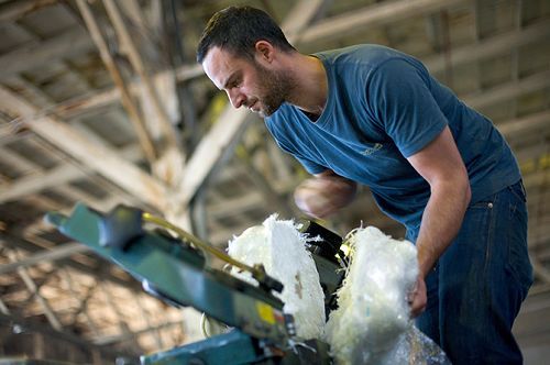 圖7:srPET塑料板的制作過程是這樣的:首先,工作人員把纖維放到鋼壓機當(dāng)中進(jìn)行堆壓,然后再被運到里士滿,放入烘烤機內(nèi)被烤成固體塑料。工程專家認(rèn)為這種材料每平方英寸能支撐5萬磅的重量。這也就是說如果普拉斯提基號帆船建成并且成功航行,這種材料也可被用于其他領(lǐng)域。圖中所示為普拉斯提基號工程經(jīng)理馬修·格雷(Mathew Grey)正在切割聚酯纖維。