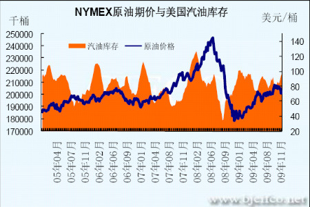 圖為NYMEX原有期價與美國汽油庫存走勢圖。(圖片來源:北京中期)