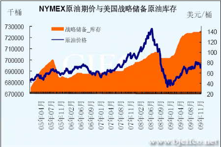 圖為NYMEX原有期價與美國戰略儲備原油庫存走勢圖。(圖片來源:北京中期)