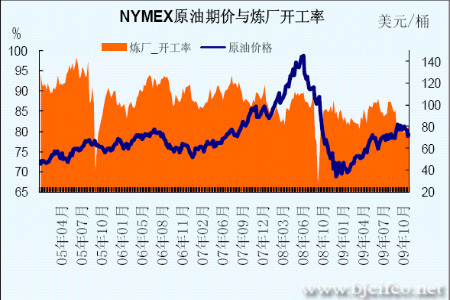 圖為NYMEX原有期價與煉廠開工率走勢圖。(圖片來源:北京中期)