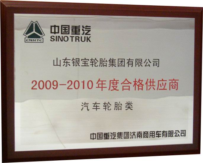 山東銀寶輪胎集團公司與中國重汽集團合作的不斷加深,除去與中國重汽特種車輛廠在輪胎新產品研發上的合作外,近日銀寶輪胎集團被中國重汽商用車公司評為2009-2010年度合格供應商。