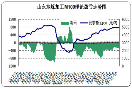 圖為山東地煉加工M100理論盈虧走勢圖。(圖片來源:金銀島)