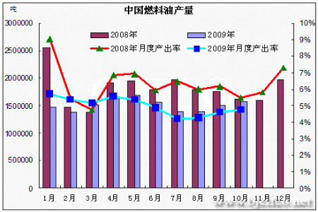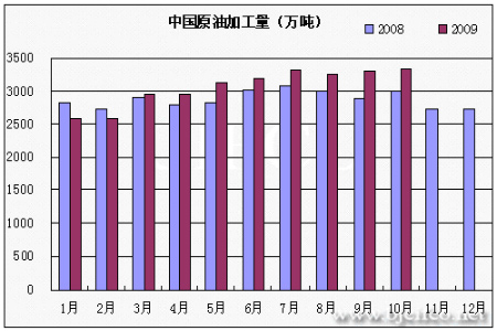 中國10月份燃料油產量為158萬噸,產量已經連續兩個月環比上升,上一個月產量為151萬噸,10月份原油產量同比仍下降了9.1%,今年前10個月份燃料油產量為1540萬噸,同比減少了近20%。另外,我們看到中國的原油加工量仍處于較高水準,10月份原油加工量為3329萬噸,環比增加1.4%,同比則增加了10.4%,今年前十個月原油加工量超過3億噸,同比增加5.2%。