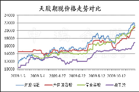 圖為天膠期現(xiàn)價(jià)格走勢(shì)對(duì)比圖。(圖片來源:中瑞金融)