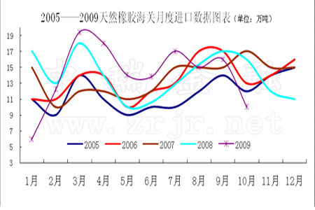 進(jìn)口方面,中國(guó)海關(guān)總署11月11日公布的初步數(shù)據(jù)顯示,2009年1至10月,中國(guó)進(jìn)口天然橡膠(包括膠乳)141萬噸,較2008年同期的145萬噸下滑2.8%。其中10月天然橡膠進(jìn)口量為10萬噸,環(huán)比大幅下挫37.5%。
