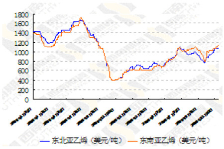 圖為乙烯及現貨價格走勢圖。(圖片來源:西南期貨)