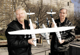 理查德-布蘭森與設(shè)計(jì)師伯特-魯坦共同展示太空船二號模型