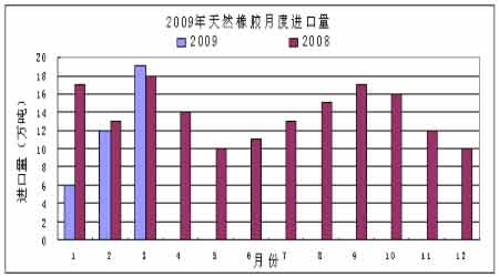 圖為2009年天然橡膠月度進口量走勢圖。(圖片來源:中誠期貨)