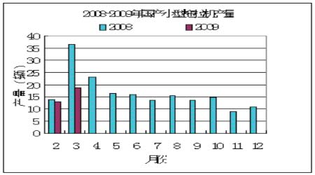 從圖表中可以知道,2、3月份我國汽車、大中型拖拉機產量同比都呈增長態勢,只有小型拖拉機產量同比下滑。汽車3月份產量為116.9萬輛,再次位于全球之首。一季度,由于國家實施汽車產業振興計劃,對農用汽車、小排量汽車補貼力度加大。中國汽車工業協會統計顯示,今年一季度國內車市在去年下半年出現負增長的情況下止跌回穩,汽車產銷分別為256.76萬輛和267.88萬輛,同比增長1.91%和3.88%。此數據顯示國內汽車業“產銷兩旺”。上汽通用五菱、長安等企業的微車產品3月份產量同比分別增長47.5%和78.5%。大中型拖拉機產量繼續大幅上漲,合計產量達到42212臺,同比增長42.8%。表明市場需求良好。