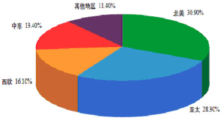 首先, 世界LLDPE產能集中于四大地區,分別是北美、亞洲、西歐和中東地區. 上述四地產能分別占全球總產能的28%、27.2%、16%和16.4%,其產能之和占全球總產能的87.6%。中東仍是產能增長最快的地區。分國家看,美國、沙特阿拉伯、加拿大、中國和巴西位居世界產能的前五名,五國產能之和占世界總產能的50%,日本已于2006年退出前五名,位居第六。根據各國產能擴建計劃,2006—2009年間世界LLDPE產能將增加675.1萬噸/年,年均增長率為6%。如下所示為LLDPE的全球產能分布圖: