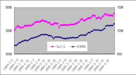 2009 年鄭州主力TA 收盤價與亞洲PX 價格對圖