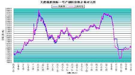 國內銷區方面,月初開始現貨貨源一直緊張,宏觀面利好頻出,芒街封關也對市場報價有利好作用,再加上炒作情緒助推,現貨市場漲勢明顯。但至月末已經從前期的炒作泡沫中逐漸回歸理性,國產標一膠、3#煙片等人民幣報價已經逐漸從16000元/噸的高位回落到14500-14800元/噸。