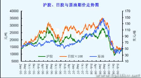 原油期貨作為世界第一大商品期貨,對于其他期貨品種有著廣泛的影響作用。而它和天然橡膠還有著更深一層的聯系。我們知道,天膠的主要用途是生產輪胎,作為生產輪胎的另一種主要原材料就是合成橡膠,其與天然橡膠的生產配比幾乎要占到總用量的一半左右。而生產合成橡膠的原料是原油。這樣一來,由于他們之間較強的替代作用,使得兩者間的價格連動性更強。