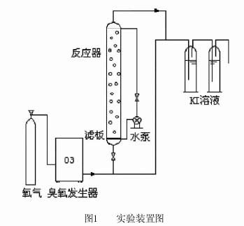 制取臭氧所用原料為氧氣,將其通入臭氧發生器中,氧氣壓力為0.06Mpa,激發電流50mA,用Na2S2O3標準溶液滴定臭氧發生量(6.01mg/min)。反應器由不銹鋼制成,尺寸為高1850mm,內徑50mm,有效容積3L。反應器上下口之間安有磁力循環水泵,實驗前先用蒸餾水沖洗反應器,再用臭氧預處理4min以去除反應器中可能消耗臭氧的干擾成分,然后排空,再用蒸餾水沖洗兩次。泵入3L自來水(PH值7.03 ̄7.06),控制臭氧投量(2mg/L),臭氧通過反應器底部濾板形成細小氣泡進入水溶液,反應15min。臭氧尾氣用2%的碘化鉀溶液吸收。