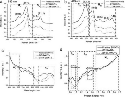 圖2 選擇性分離前后碳管樣品的Raman 光譜(a,b),及紫外可見近紅外光譜(c,d)